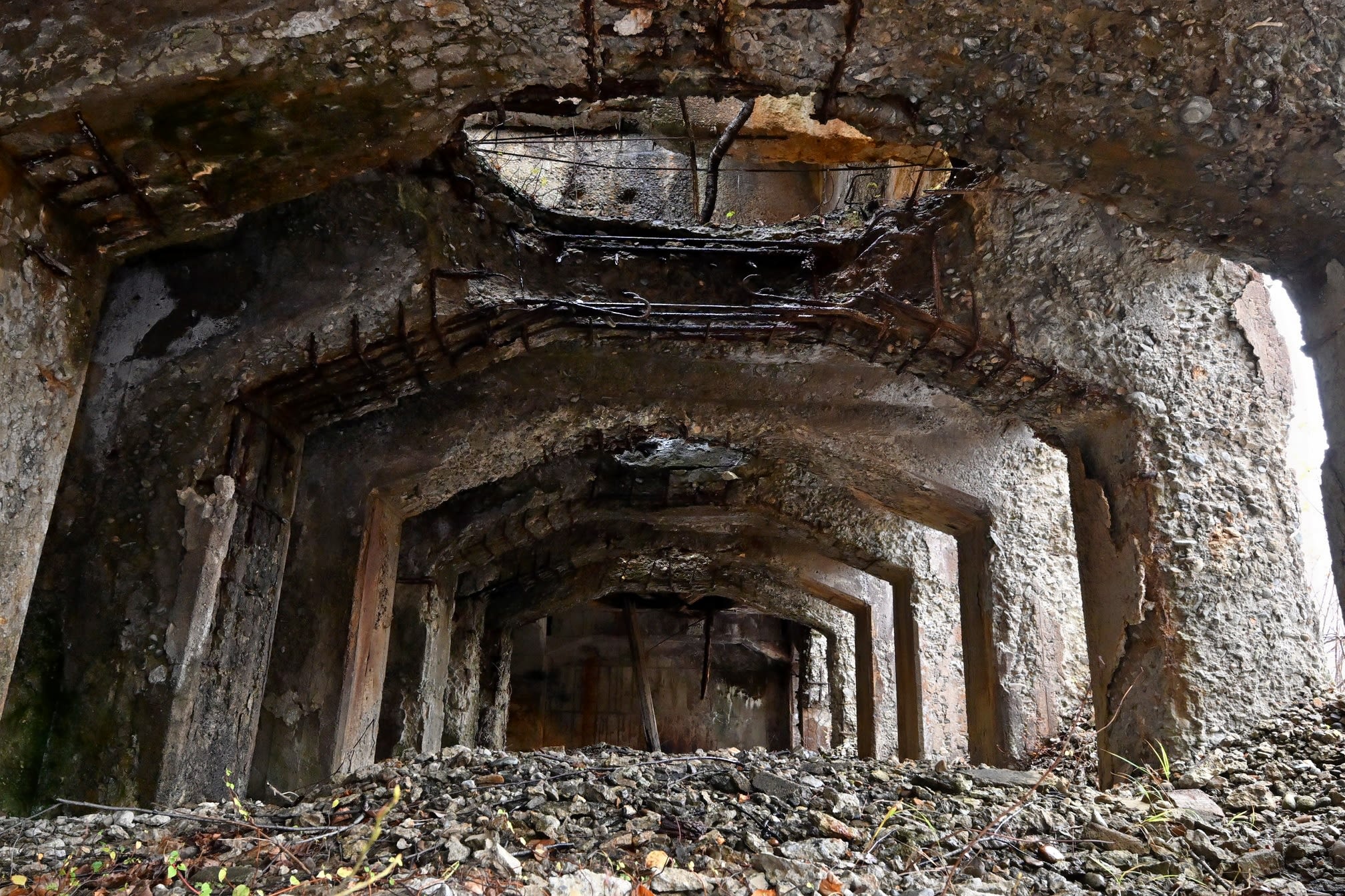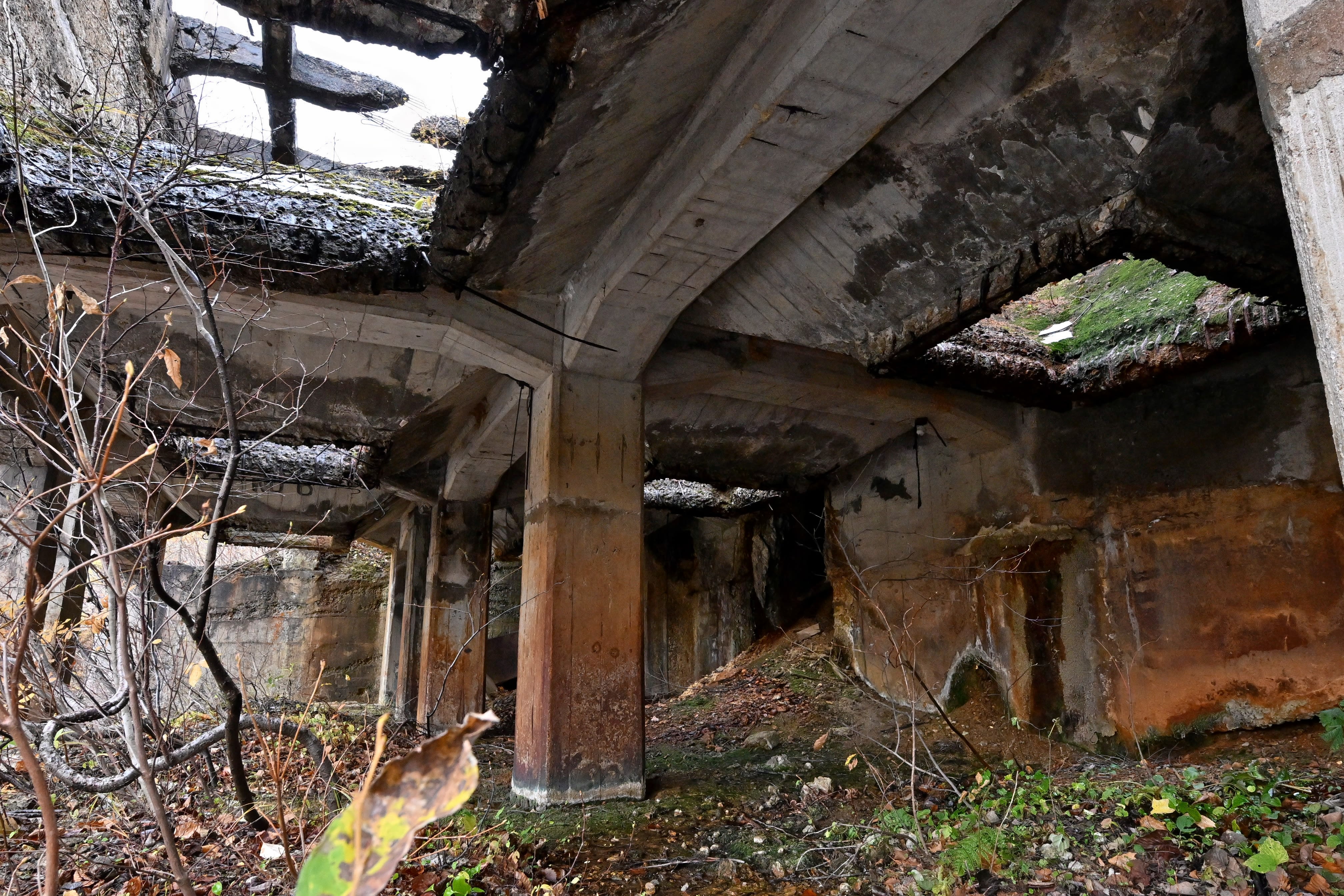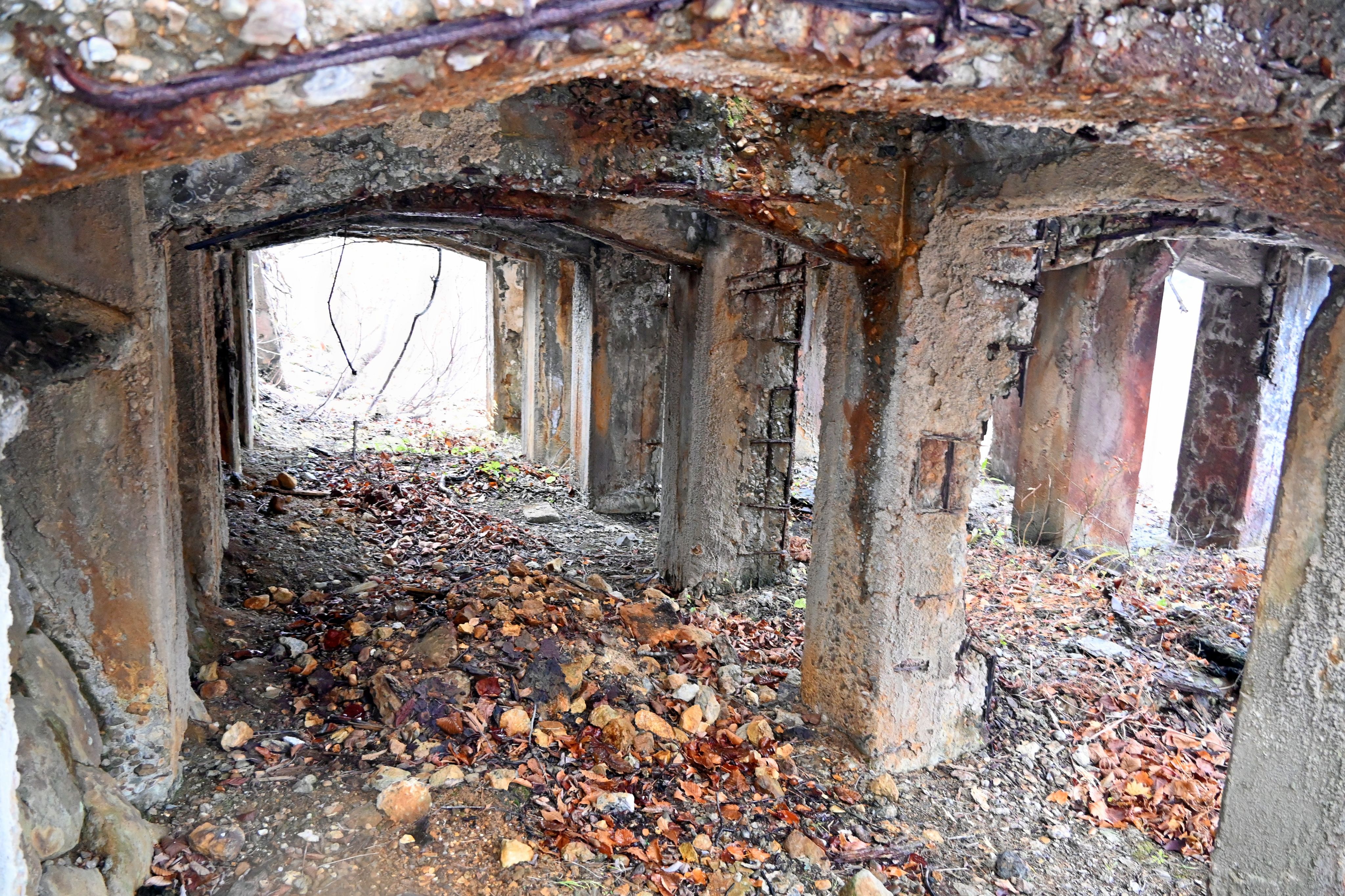 事業所の許可を得て、旧上北鉱山選鉱場の周辺を歩いた。閉山から約半世紀。木が生い茂り、やぶの中を慎重に進むと目前に、巨大な遺構が次々と姿を現した。さらに30㍍ほど登っていくと、本坑の入り口が確認できた。