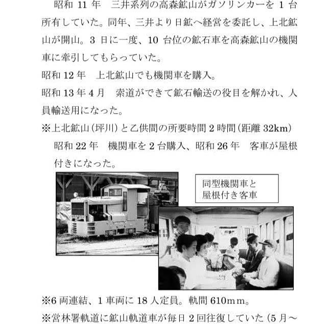 東北線乙供駅(東北町)から上北鉱山までの約30㌔区間、人や物資を運ぶため、線路を走るガソリンカーがあった。「エンジンがあって、30人は乗れた。以前は木炭車だった。2~3時間かかった」。冬は馬そりで上北鉱山と千曳(同)を1日1往復したが、5~6人しか乗れなかった。後に冬の輸送は雪上車となった。
