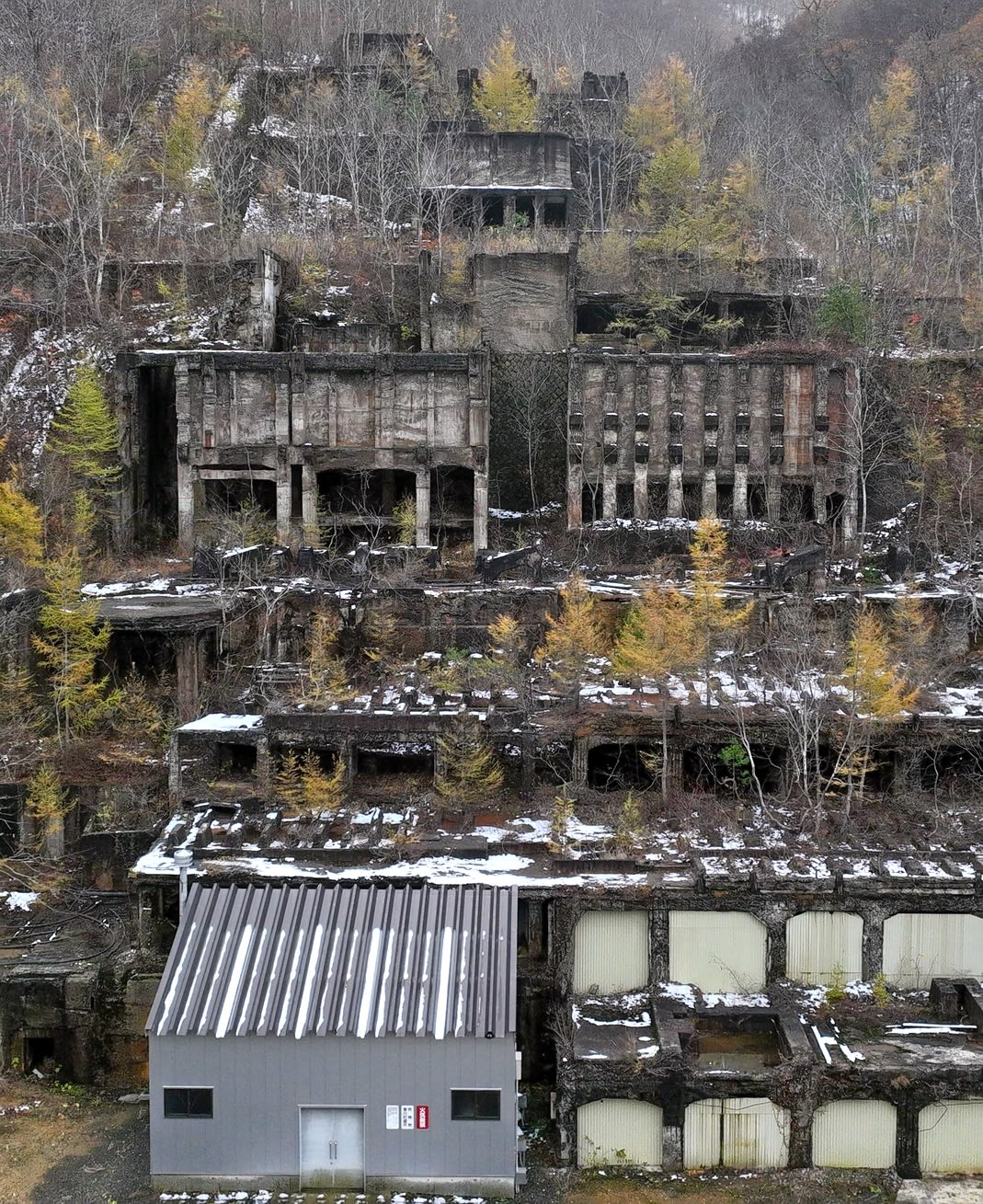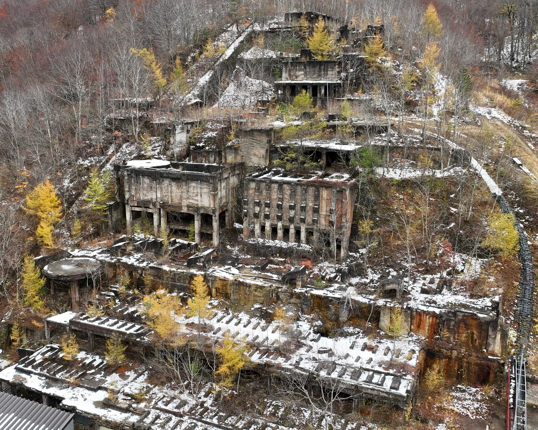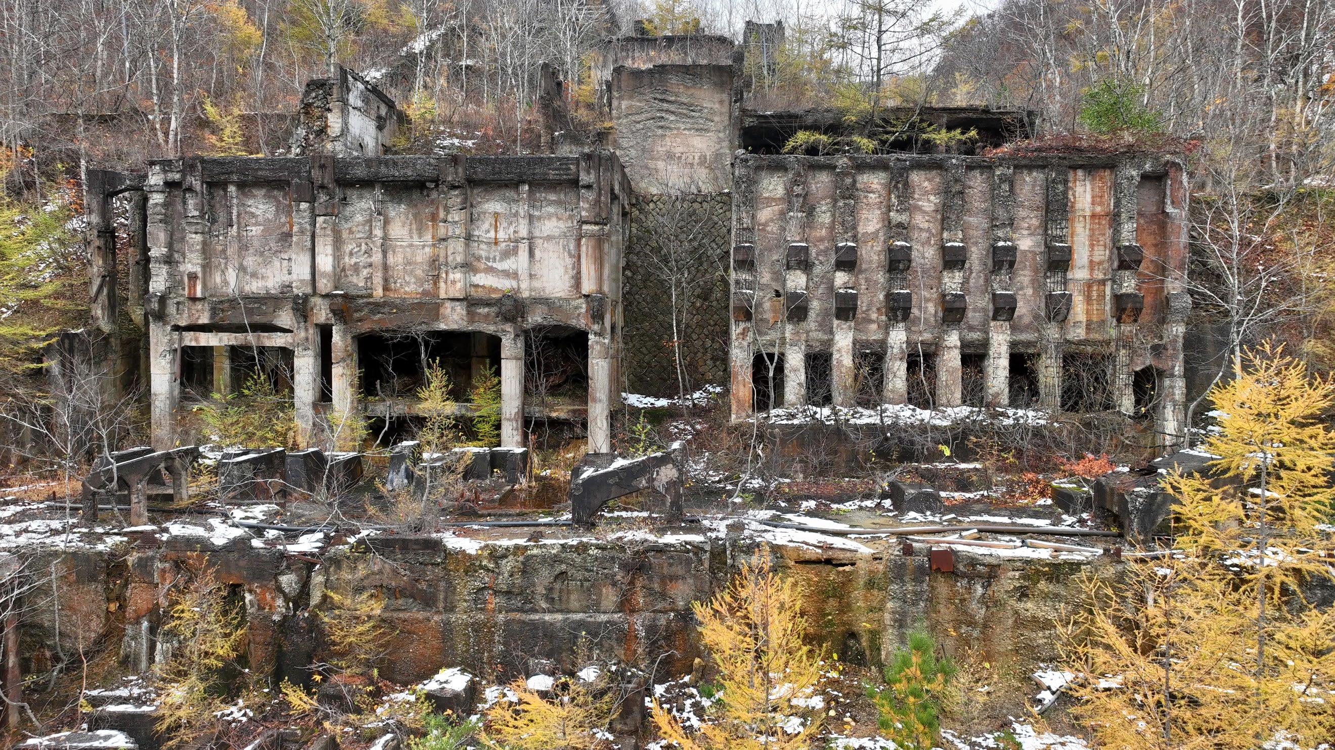 安い海外資源の輸入や資源枯渇により、1973年に閉山。現在は坑廃水の中和処理を行っており、真新しい処理場がある。残っている旧鉱山の建物遺構は55年に拡大したという選鉱場(鉱物を選別する施設)のみだが、威容を誇る巨大な遺構が最大4千人超が生活した往時をしのばせる。