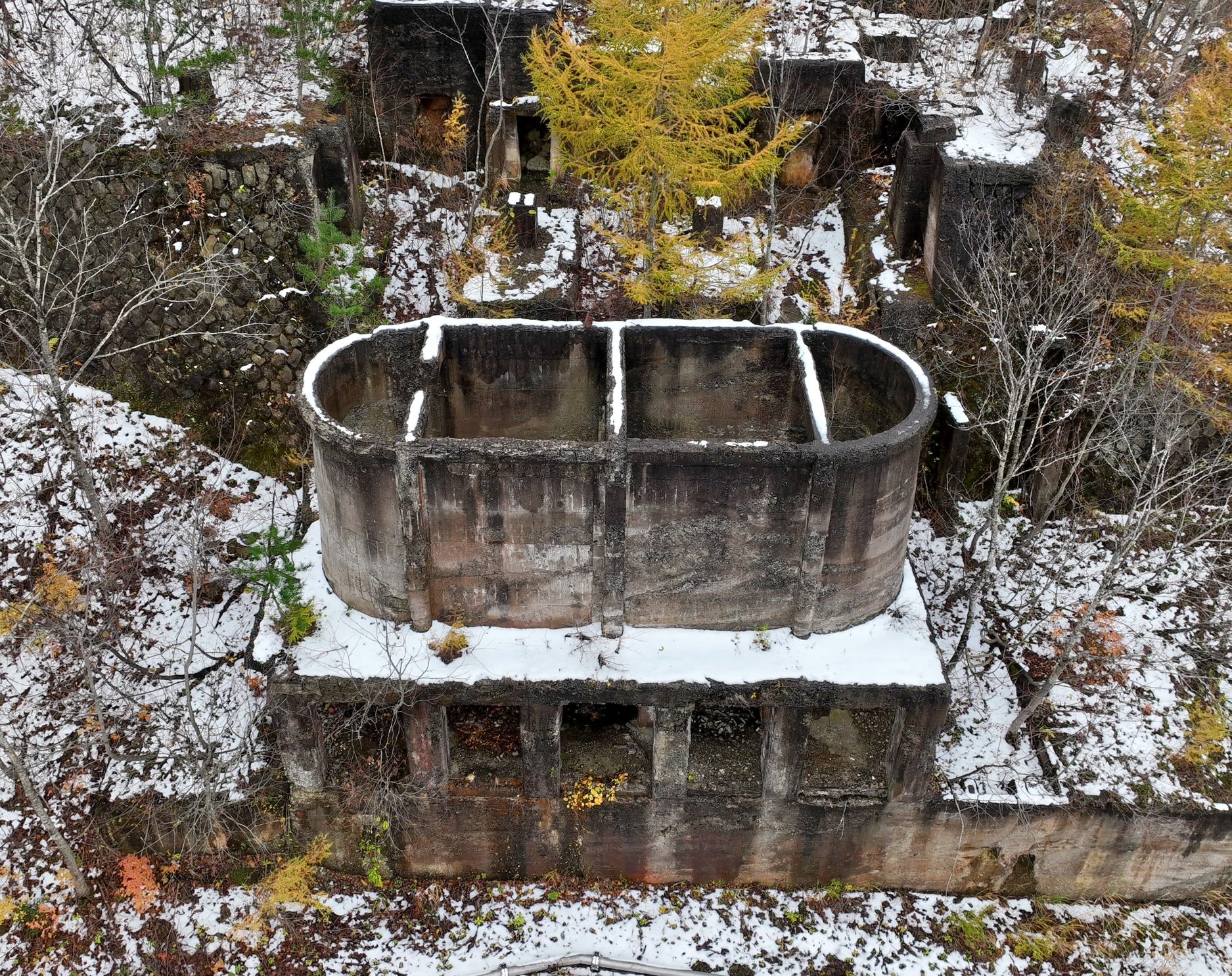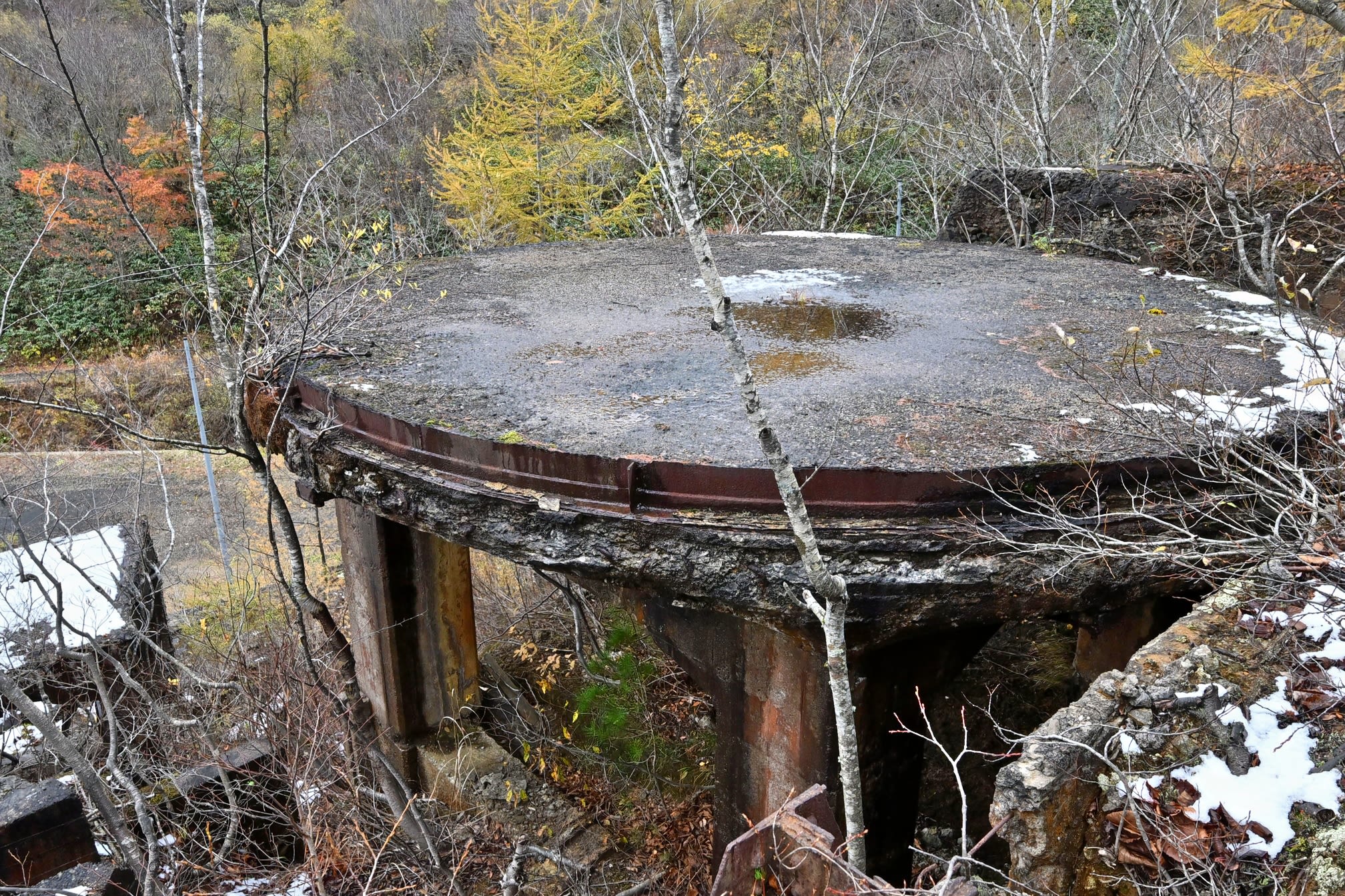 11月8日、前日夜に初雪を観測した青森市を車で出発し、ところどころ雪が残る八甲田の道を1時間半ほど走らせ、七戸町の旧上北鉱山に向かった。林間の砂利道をゆっくり進むと、かつての選鉱場が見えてきた。近くには、鉱害防止に向け、旧坑道から出る金属を含んだ水を消石灰で中和して無害化する施設がある。