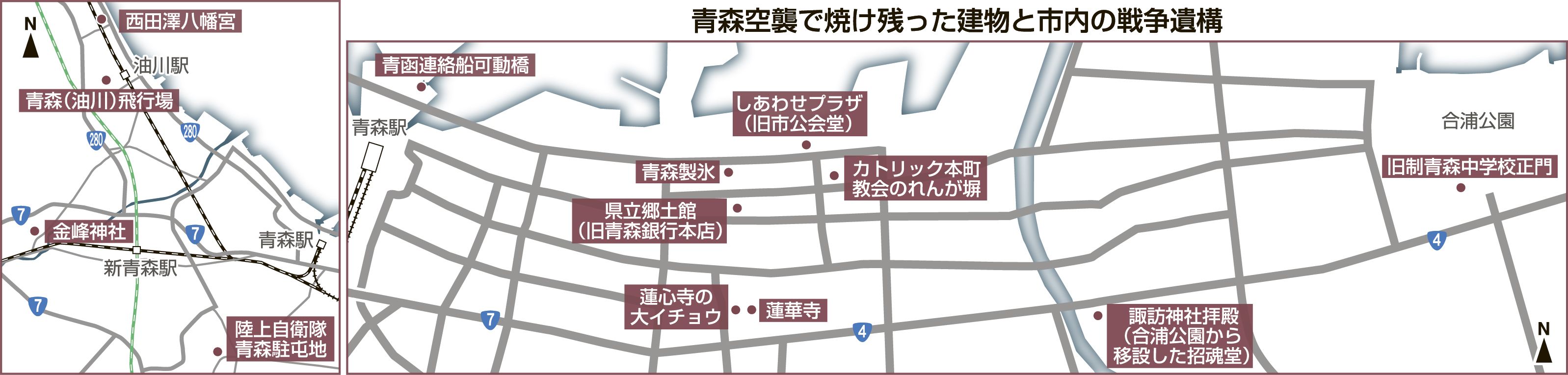 青森市は、青森空襲で多くの施設が焼かれた上、戦後80年もの年月が経過し、戦時中の姿をとどめる遺構は少なくなってしまったが、空襲の惨禍を耐えた建物などがわずかながら残る。