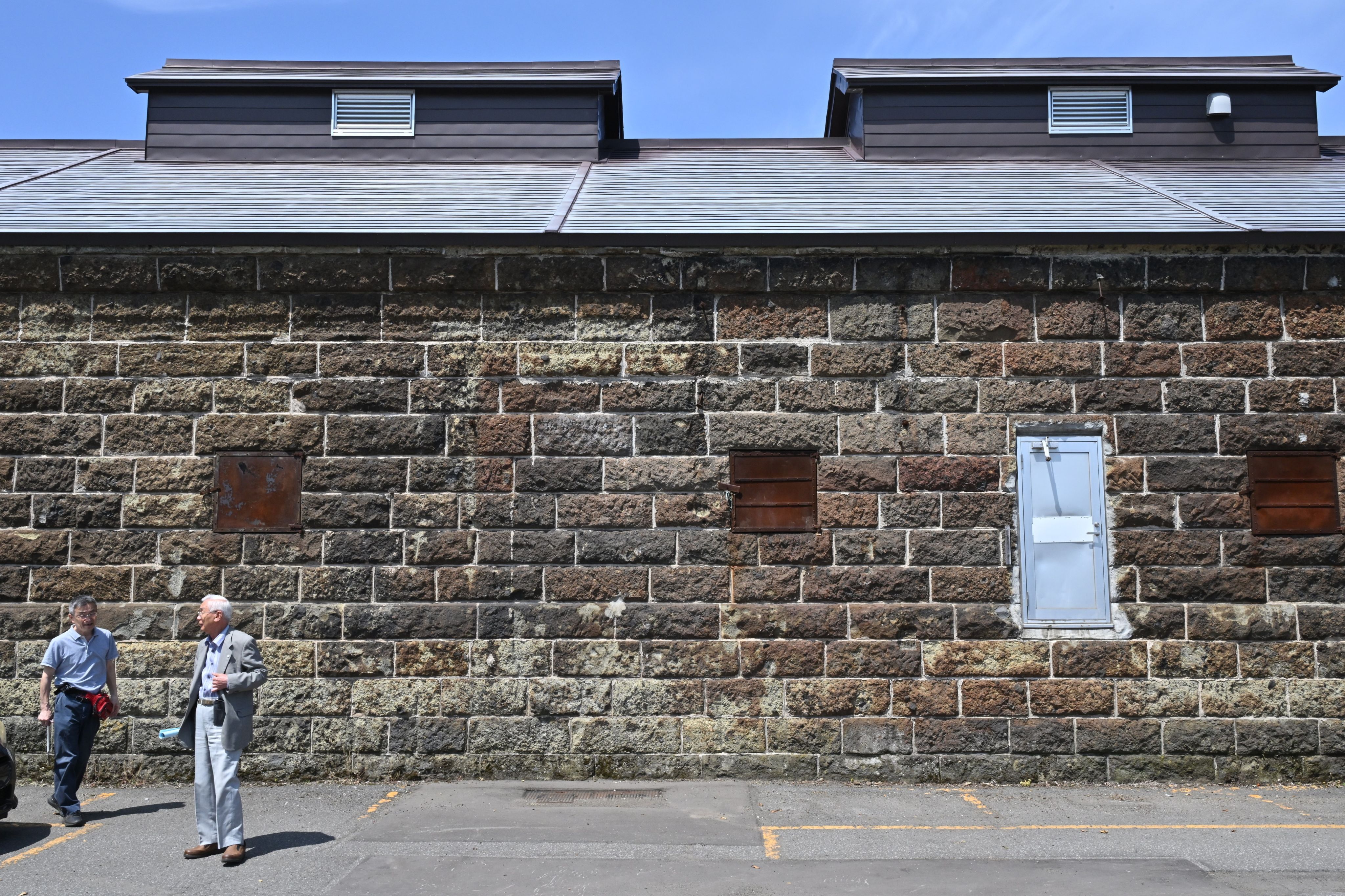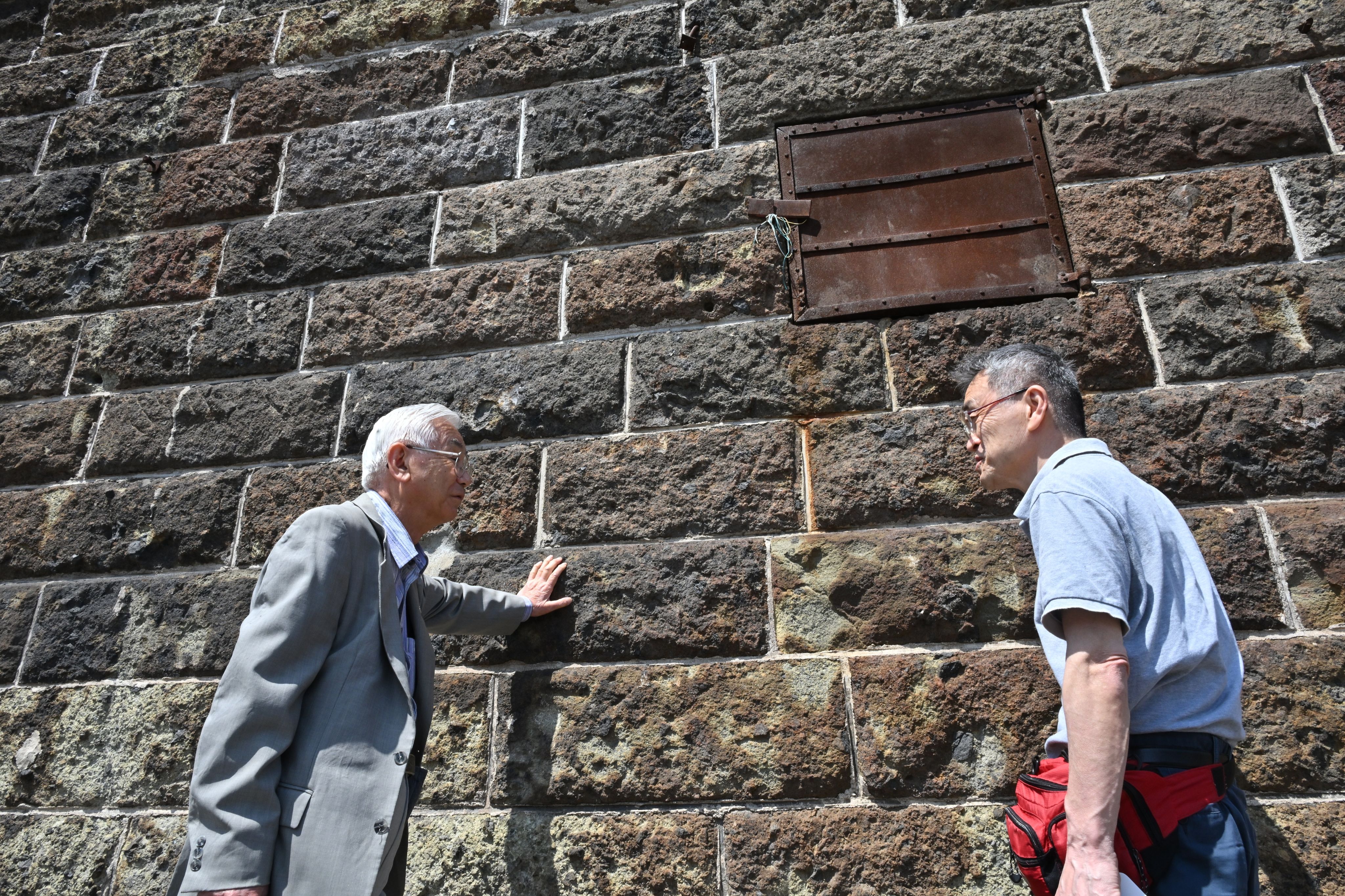 焼夷(しょうい)弾の威力を示すように、今も外壁の石一面が黒焦げ、かつて空襲に遭った町であることが分かる。社長の佐々木平藏さん(79)は「下北から石を運んできて緻密に積み上げたと聞いている」と話す。今村さんは「この辺りは当時の繁華街で空襲の被害が大きかった」と語る。