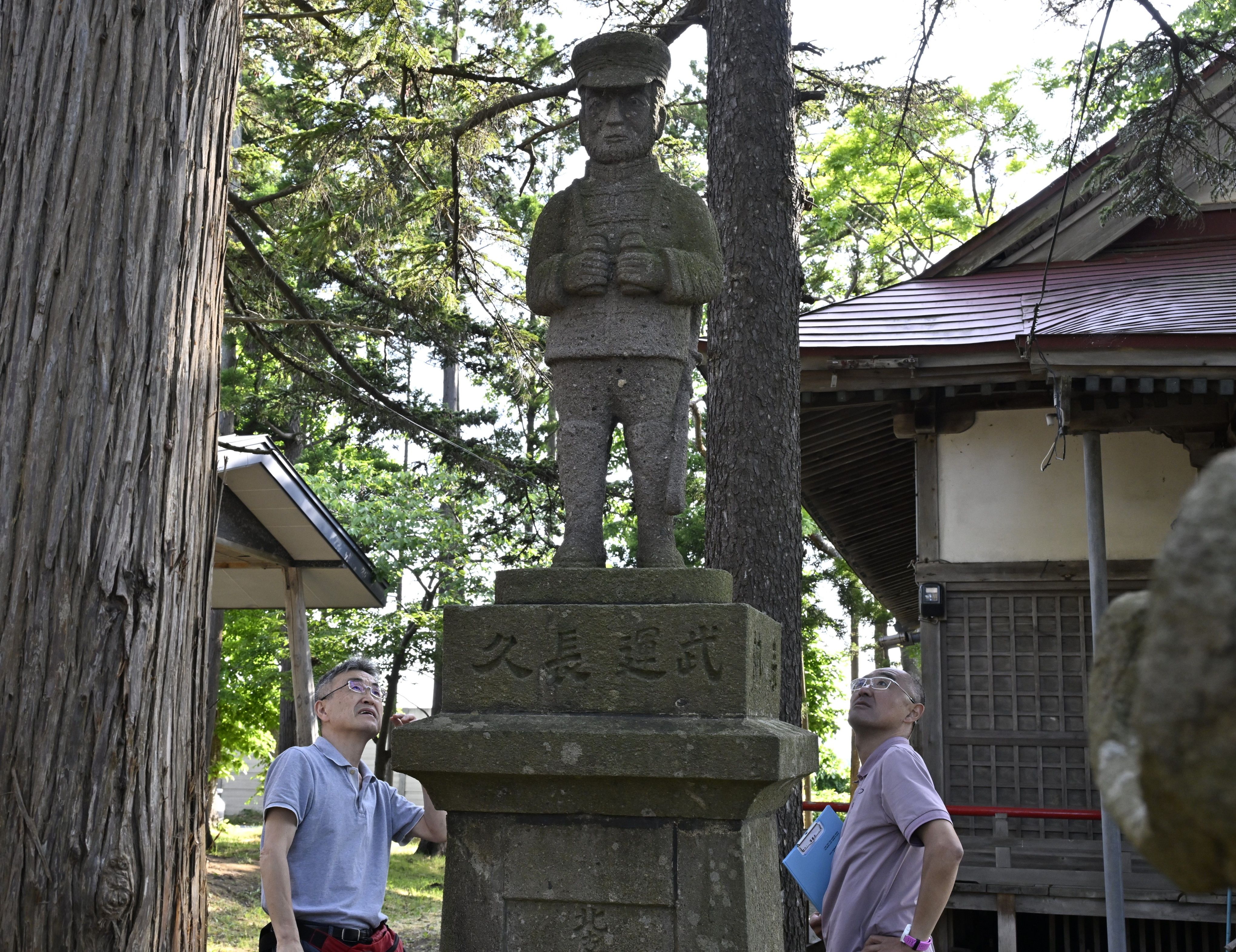青森市西田沢地区の西田澤八幡宮には、台座部分に武士や兵士が戦場で勝利し、無事に帰還することを願う「武運長久」と、「北支事変戦捷(せんしょう)祈願記念」と書かれている高さ約3メートルの軍人像が残る。