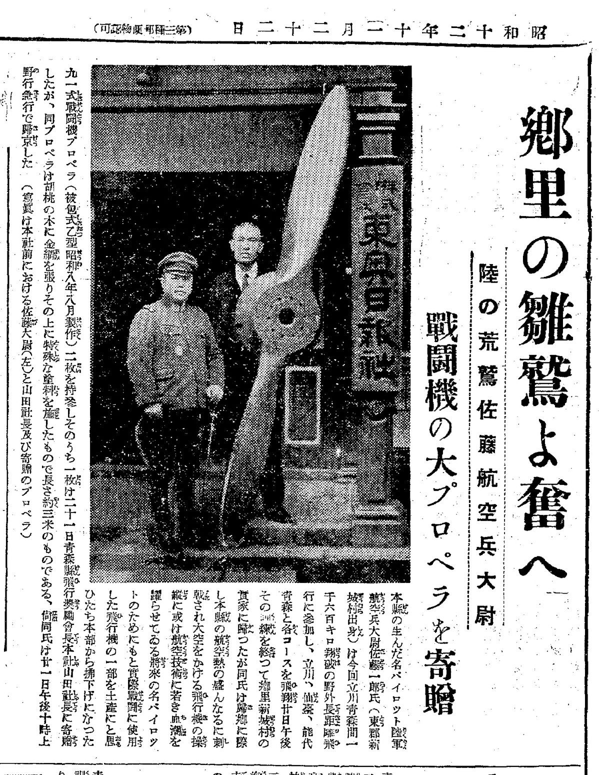 37年11月22日付の本紙に佐藤氏の本社へのプロペラ寄付の記事が載っている。佐藤氏は立川─青森間1600キロを飛ぶ野外長距離飛行に参加したパイロット。「飛行機の操縦に或(あるい)は航空技術に若き血潮を躍らせてゐる将来の名パイロットのためにも」と、払い下げになった91式戦闘機のプロペラを寄付した。プロペラは約3メートルの長さで、クルミの木に金網を張り、特殊な塗料を施したものという。