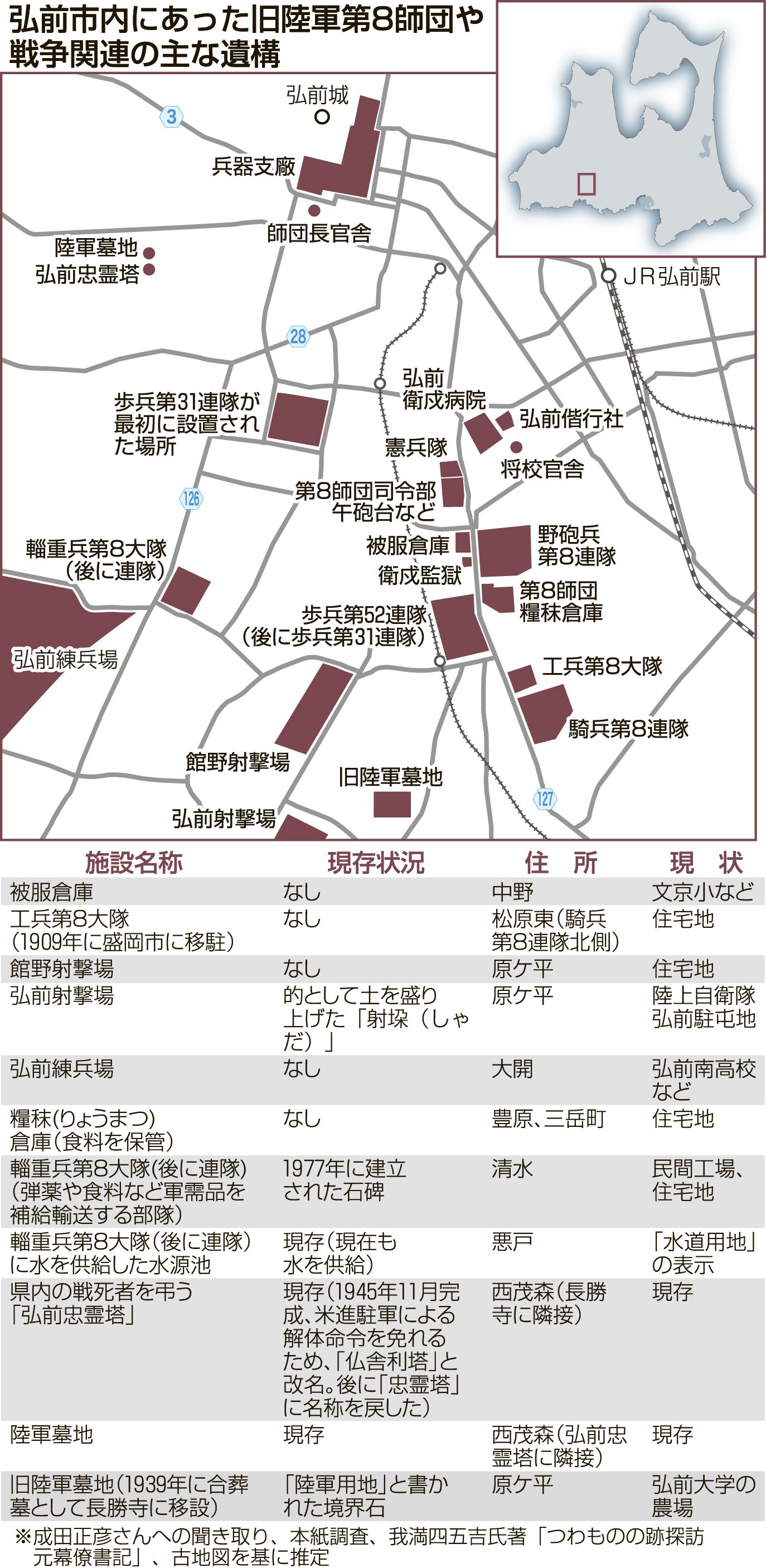 野砲兵第8連隊は敷地が約16万平方㍍の広さで、1909年の地図には兵舎、倉庫など28棟が記されている。37年、満州に派遣され、44年にはフィリピンに派遣されたが、ほぼ壊滅の状況で終戦を迎えた。かつての本紙取材で、鯵ケ沢町を中心に岩木山麓に広がっていた山田野演習場で毒ガス実験の中核を担ったことも分かっている。