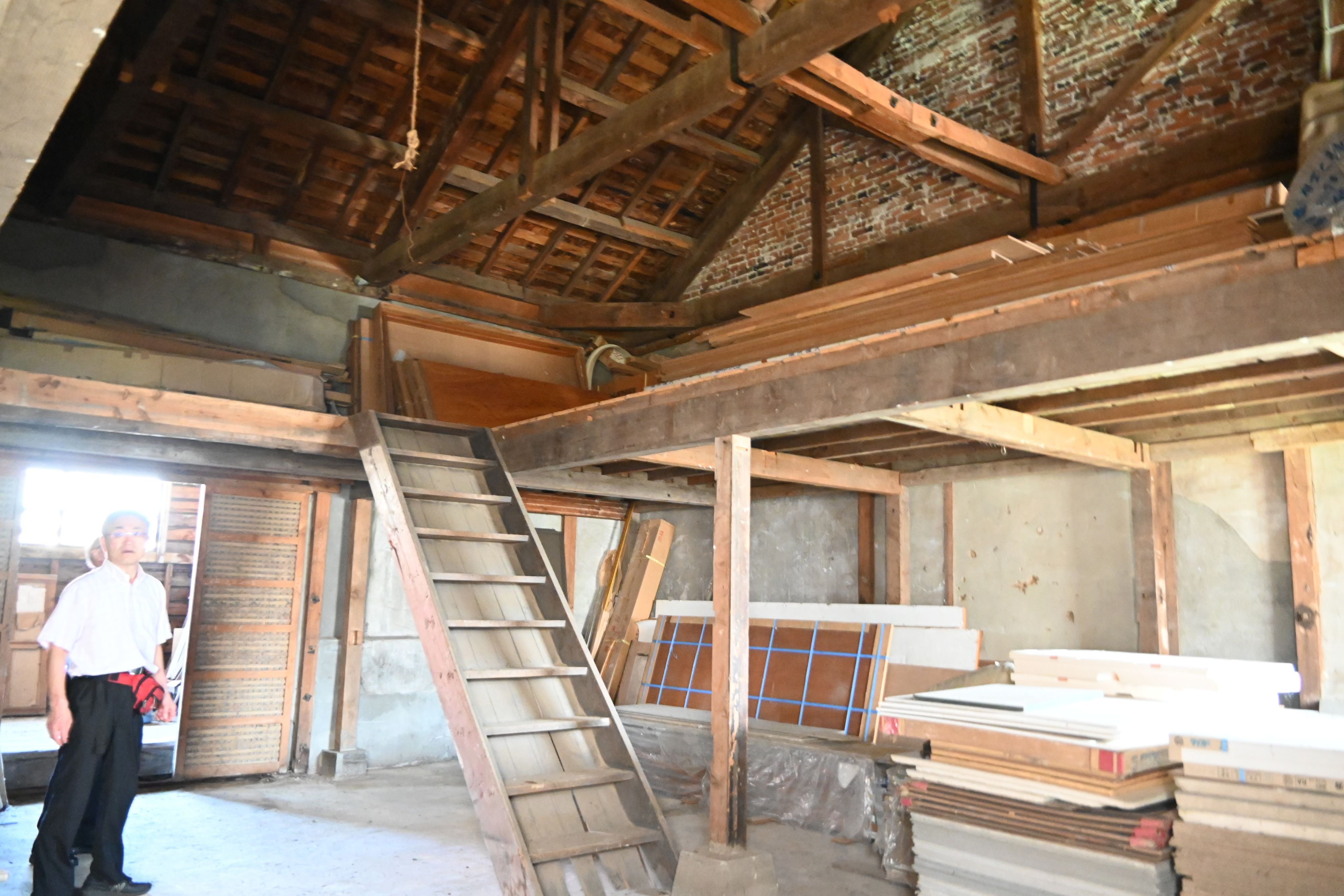 中を見せてもらった。木の梁(はり)などがむき出しになっているが、頑丈だ。「ある程度、人の動きがないと建物は傷んでしまう。建物も人間と同じく呼吸しているから、たまに開けたり、人が出入りしたりして、大事にすると残っていく」と語る。