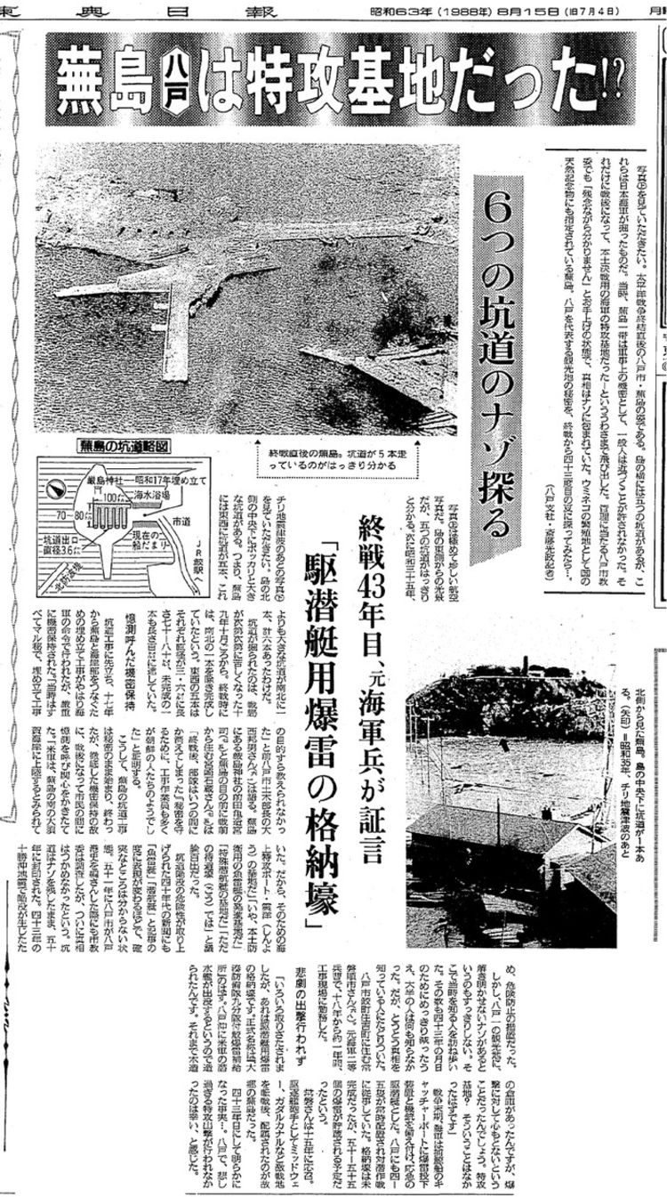 戦時中の蕪島はどんな役割を果たしたのか。当時、蕪島一帯は軍事上の機密として、一般人が近づくことは許されなかったが、本紙の88年8月15日付夕刊に、旧海軍二等兵曹で43年から約1年間工事現場で勤務した地元の男性の証言が載せられている。