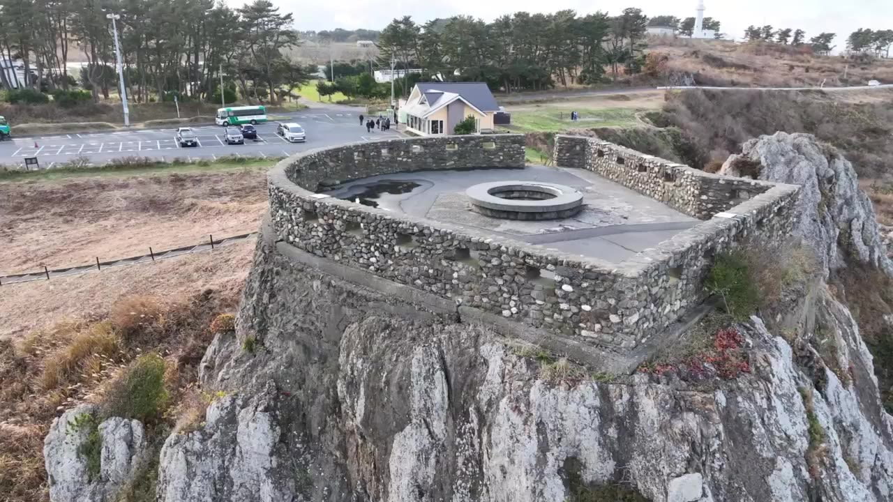 南に車を走らせ、葦毛崎展望台に向かった。鮫角灯台近くにある葦毛崎は断崖絶壁の海抜22メートルの場所にあり、石を積み上げていて、まるで要塞(ようさい)のよう。戦時中は電探基地(レーダー基地)があった。旧海軍が43年、石が積まれた基地を設置し、対空警戒のため2式1号電波探信儀を配備した。現在も円環状のコンクリート基礎がある。