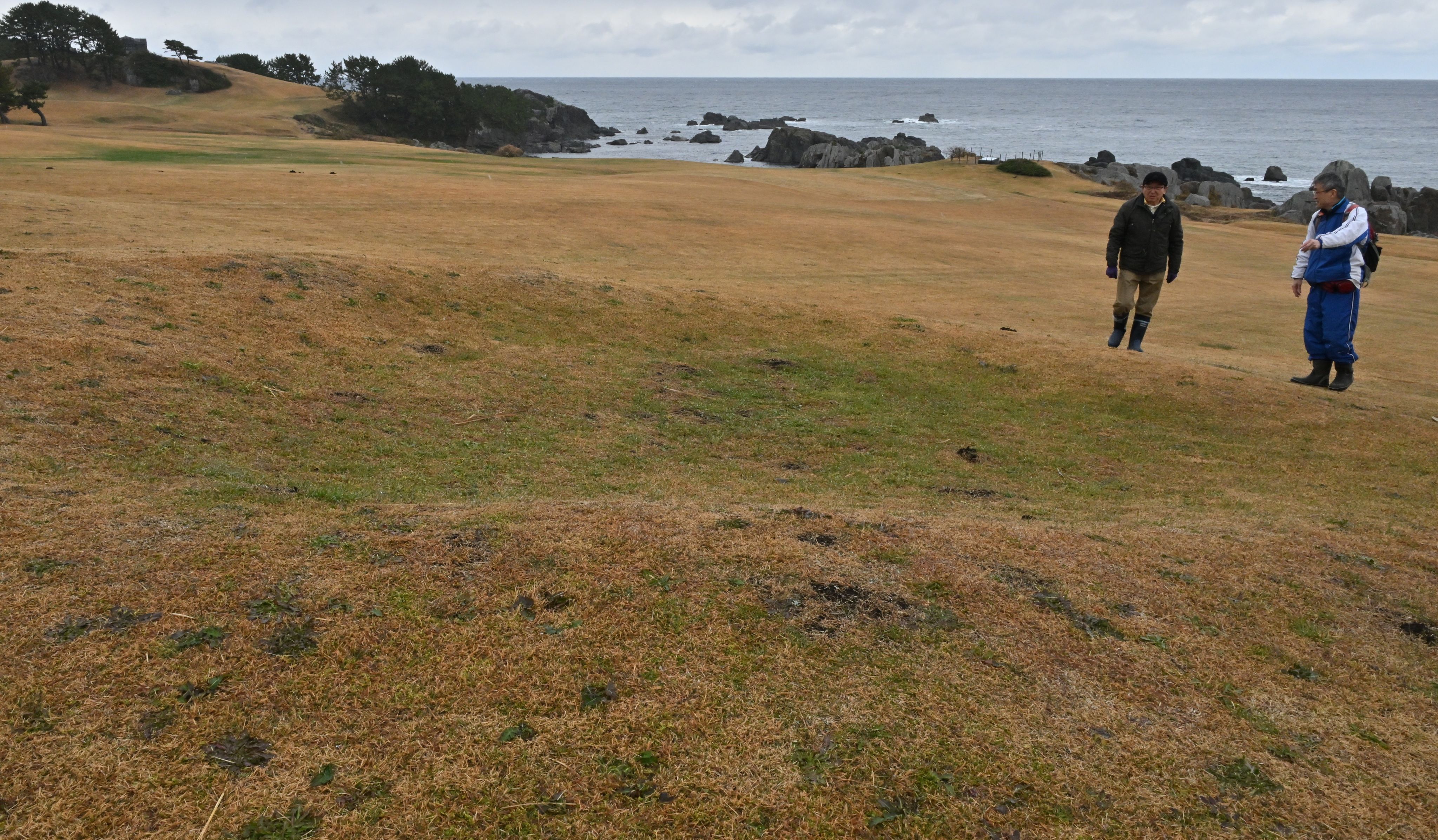 柳沢さんの自宅近くの種差海岸の丘には、不自然にくぼんだ部分がある。柳沢さんは「昔の絵はがきだと、同じ場所がこんもりと盛り上がっている。長老からここに爆弾が落ちた場所だと聞いた。戦後80年たっても、そんなに変わらない」と説明してくれた。