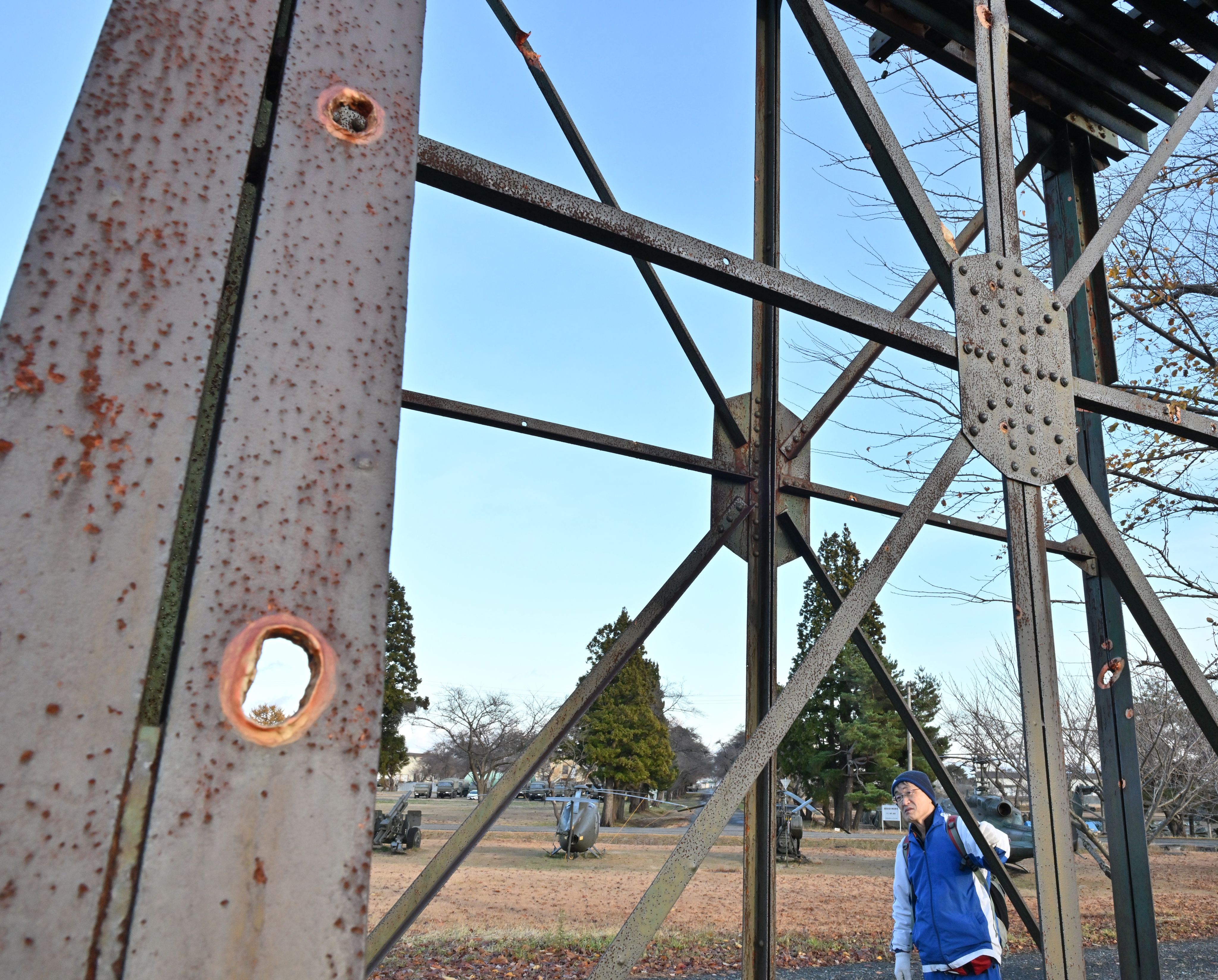 同駐屯地の広報担当者によると、戦後もしばらくは格納庫として使われていたが、2003年の建て替えに伴い、入り口近くの防衛館前に移転したという。「連続して撃たれた跡。こうやって展示している場所は珍しい」と小泉敦さん。厚い鉄を貫いたいくつもの弾痕は、戦争の爪跡の大きさを物語る。