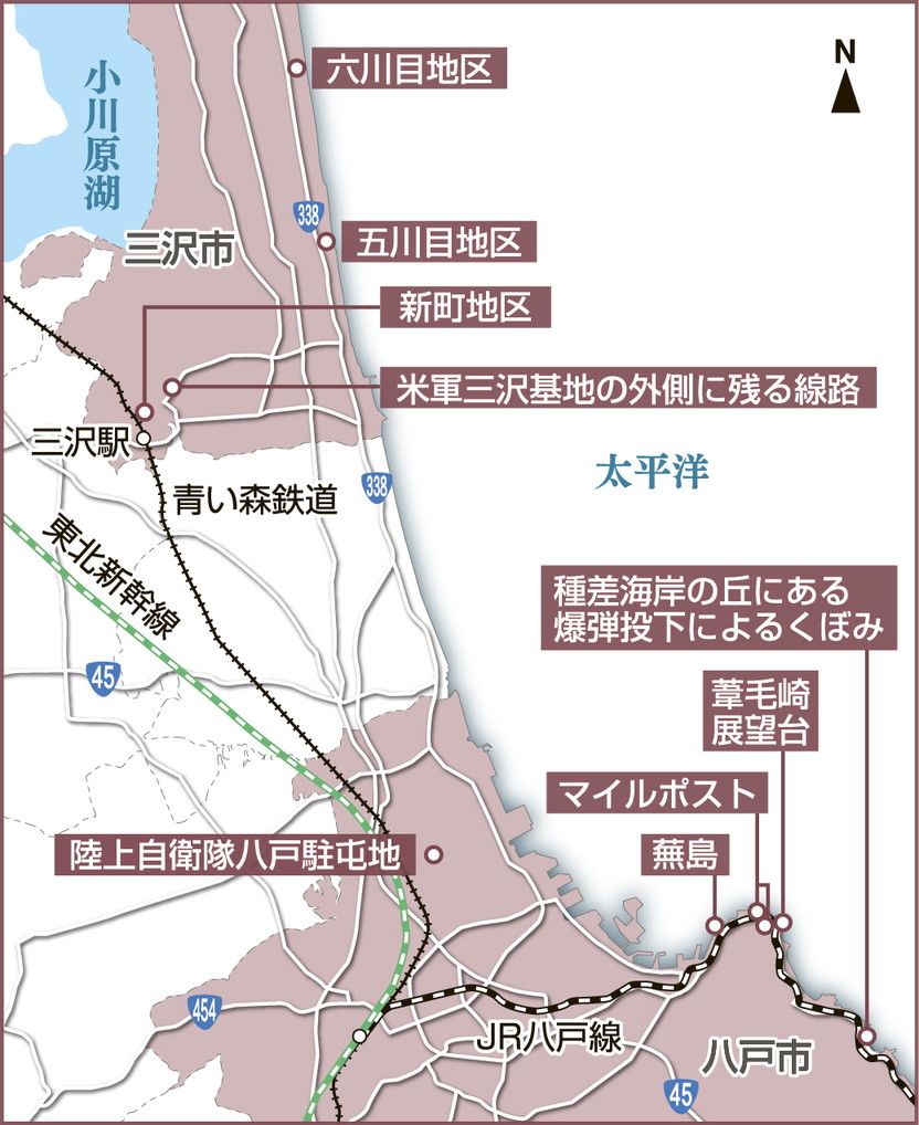 計3回の三沢への空襲で破壊・焼失した施設もあったが、川村さんは「戦争遺構はむしろ、米軍基地建設と新しいまちづくりでほとんどがなくなった。昭和30年代に海軍士官の休息施設もなくなり、近年まで残っていた官舎も今はない」と話す。今は数少ない遺構として、基地近くの線路と新町地区の防空壕(ごう)跡が残る。