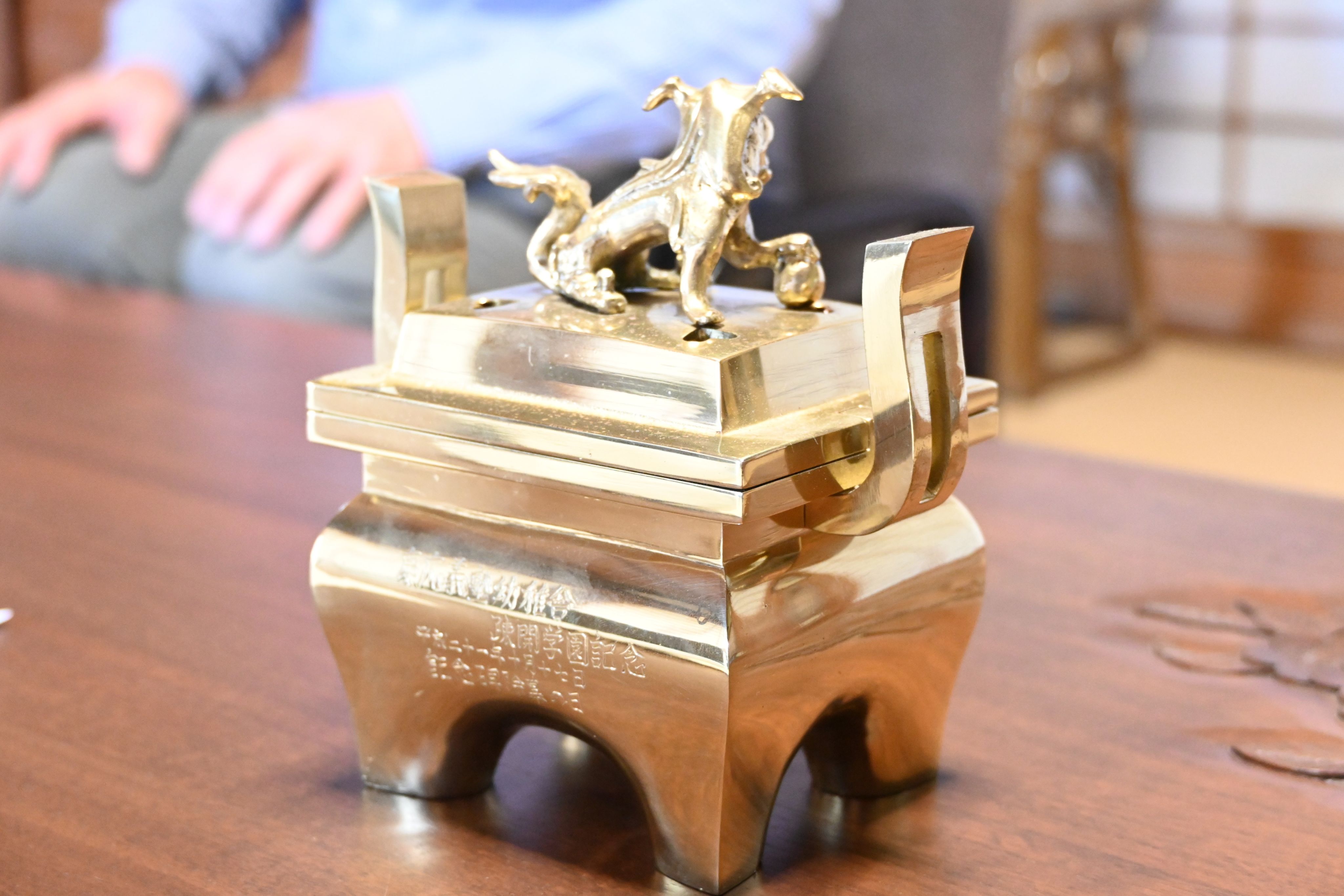 碑が建った際、西教寺には卒業生らが寄付してくれた焼香の金香炉があり、今も大切に使っている。