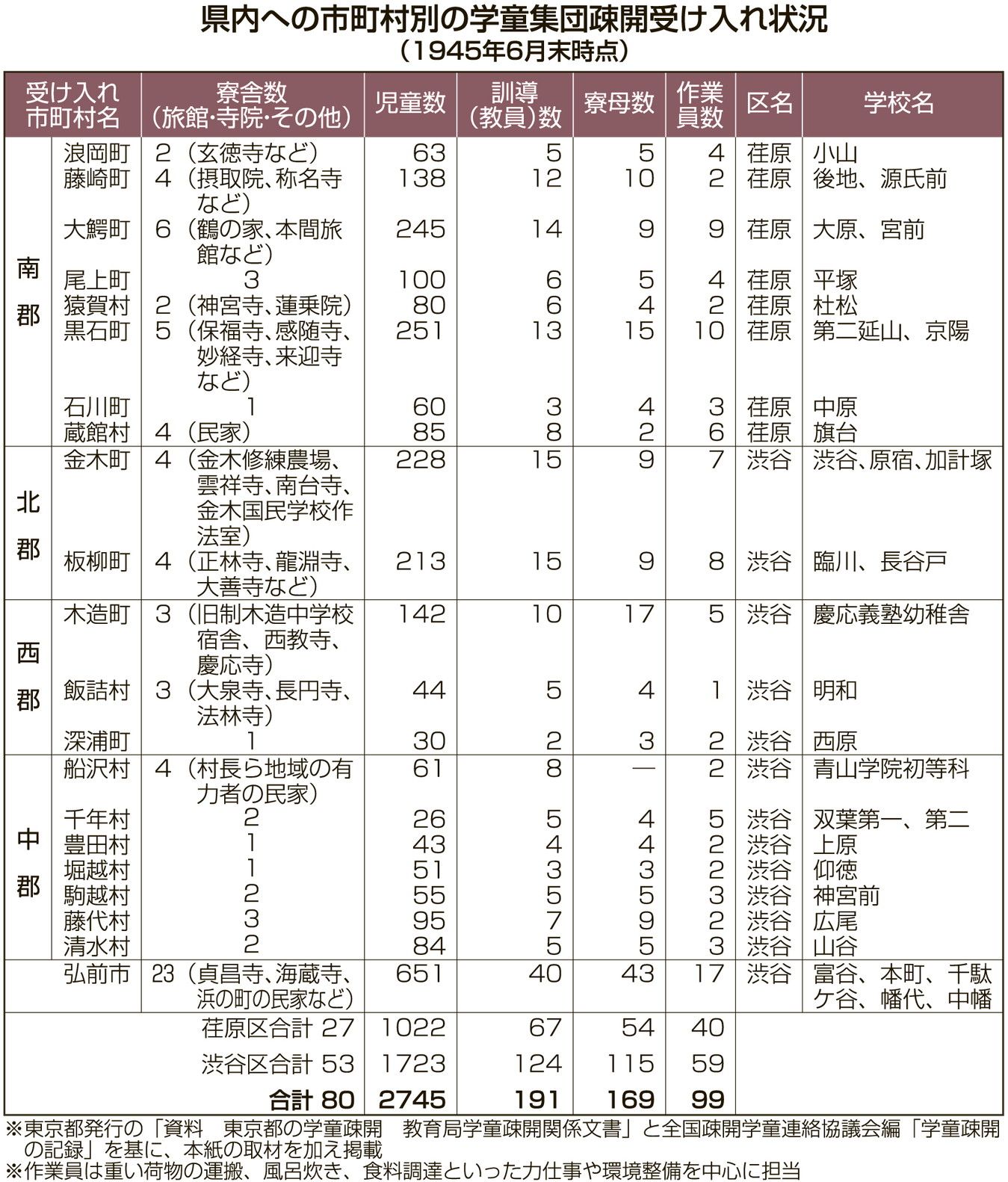 戦時中、都会の子どもたちを爆撃から守るために、国が国民学校初等科(3~6年)の児童を安全な地域へ教師の引率で避難させ、寺院や旅館、民家などで集団生活させる学童集団疎開が行われた。また、親戚、知り合いを頼る縁故疎開もあった。疎開先として、首都圏から離れた本県も選ばれた。東京都発行の「資料 東京都の学童疎開 教育局学童疎開関係文書」によると、学童集団疎開で本県に渋谷区21校、荏原(えばら)区(現品川区)11校の計2745人が訪れている。元県史編さん調査研究員の小泉敦さん(65)=五戸町=と共に、県内の疎開先や疎開に関係した人たちを訪ねた。