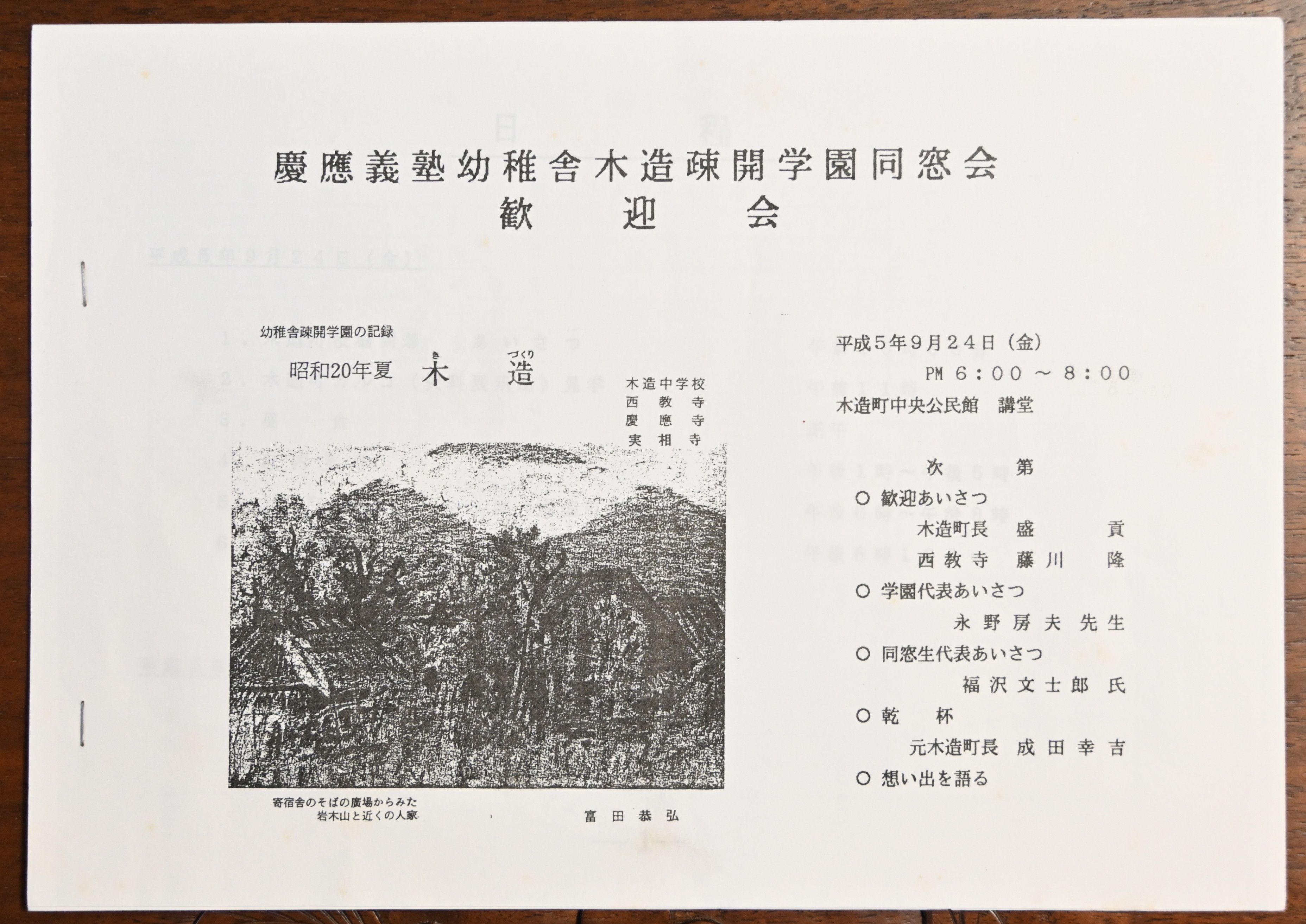 1993年に行われた慶応義塾幼稚舎木造疎開学園同窓会歓迎会の資料(西教寺提供)