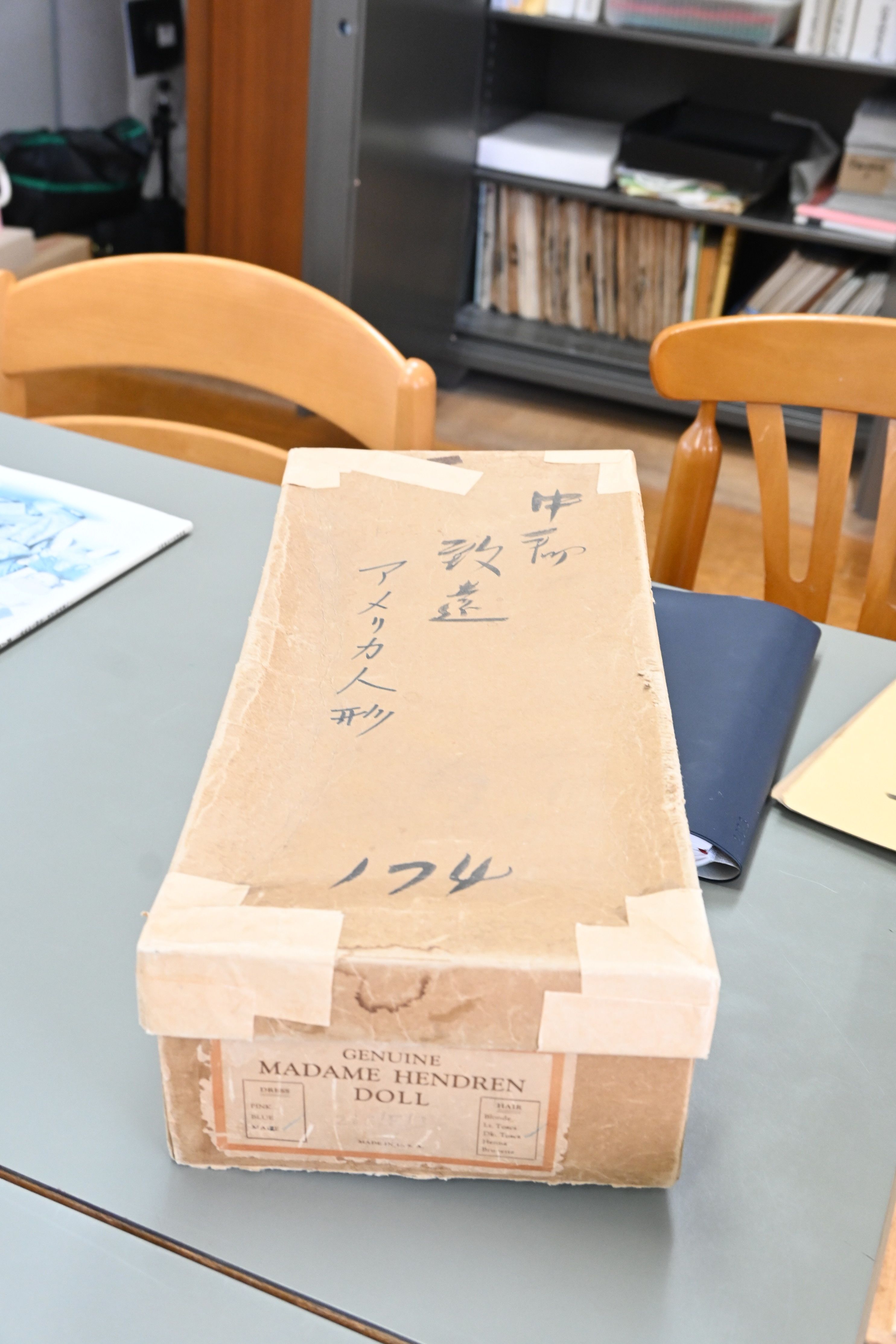 3月、弘前市の致遠小学校を訪ねた。友情人形「シドニー・エル・グリック」は校長室の入り口の棚に子どもたちに見えるように展示している。横になると目を閉じる。贈られてきた当時、人形が入っていたとみられる「中郡 致遠 アメリカ人形 174」と書かれた箱も残る。