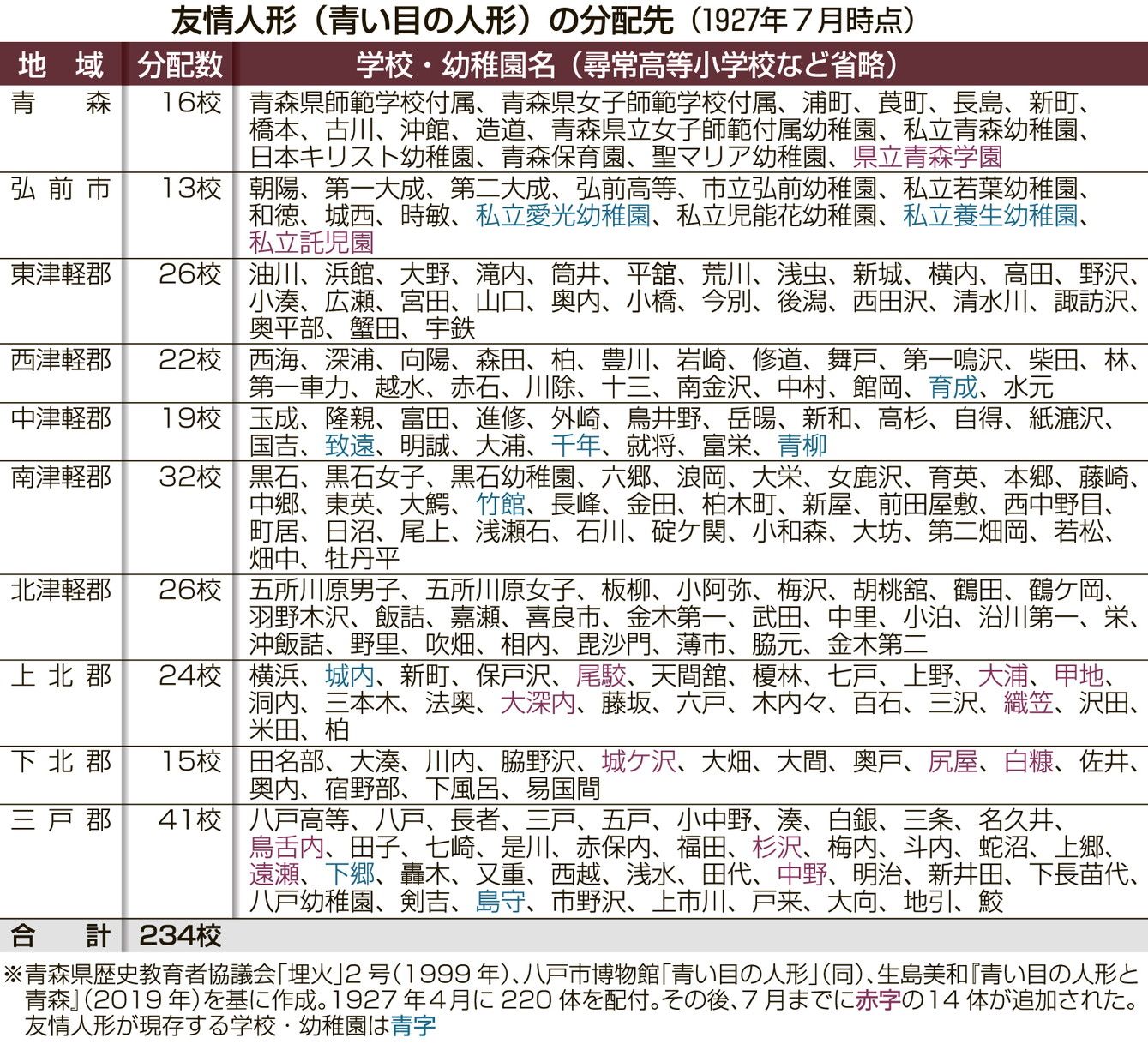 1920年代、米国での移民排斥運動をきっかけに、日本と米国は国民を巻き込む対立が生じていた。親日家の米国人が状況を憂い、人形を活用した子どもたちの交流を思いついた。民間組織を立ち上げ、27年、約1万2千体の青い目の人形を日本に贈った。日本では、歓迎会も行われ、子どもたちにもかわいがられた。しかし、41年、太平洋戦争に突入。多くは焼かれたり、壊されたりした。一部はひそかに保管された。県内では現在10体が確認されており、戦争の悲惨さと平和の尊さを伝える役割を担う。くしくも現在、世界では戦闘が絶えず、国際情勢が混迷している。来年は人形が贈られてから100年。今年1~4月、元県史編さん調査研究員の小泉敦さん(66)=五戸町=と共に、県内の人形についてまとめた帝京大学教育学部の生島美和准教授(当時は弘前学院大学文学部准教授)の報告書を基に、人形を訪ねた。