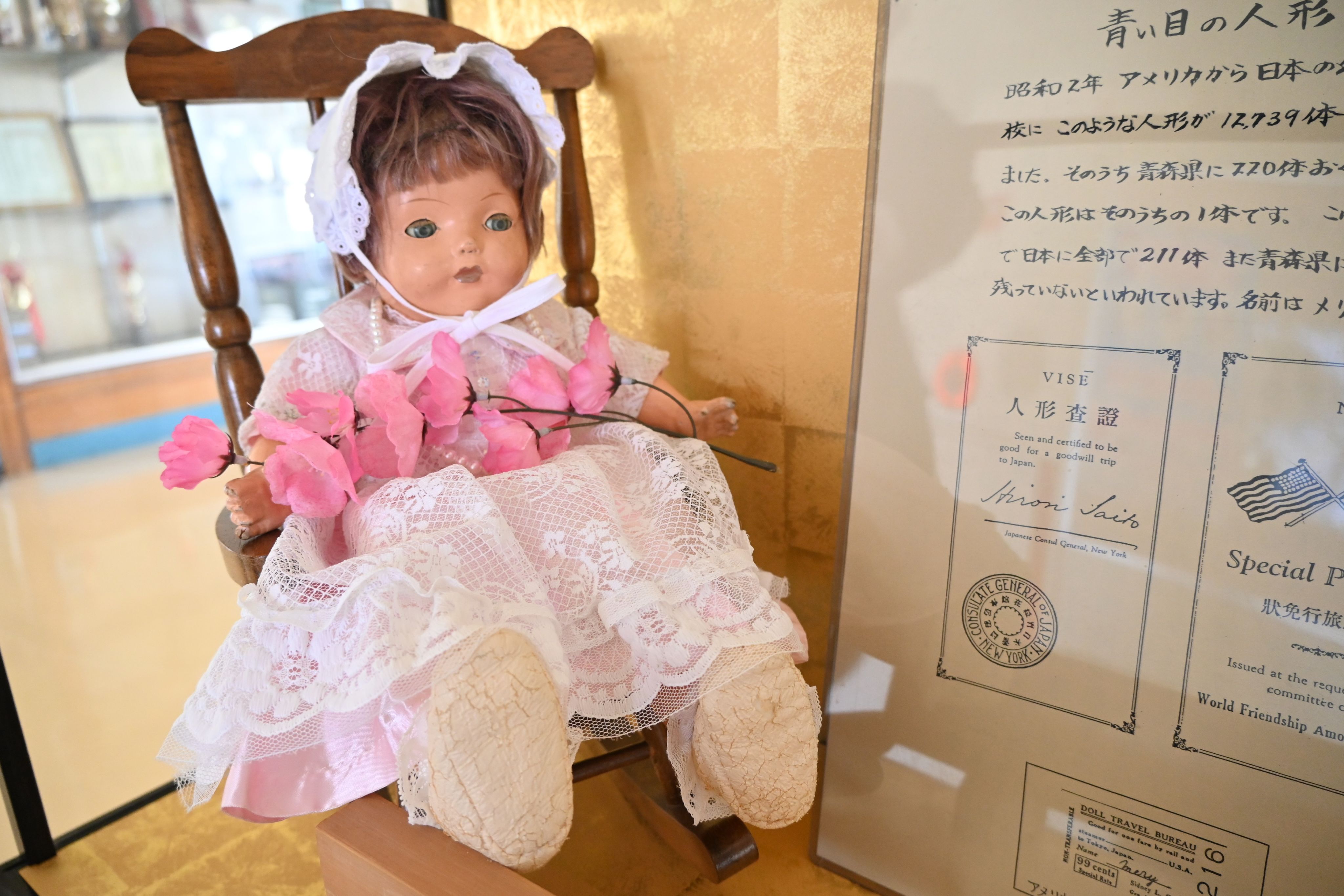 3月、弘前市の千年小学校では、同月時点で校長だった(4月から弘前東小校長)安田奈津子さん(57)が詳細を教えてくれた。友情人形「メリー」はシドニー・ギューリックの子孫が2020年に贈ってきた「チェルシー」と共に、来訪者の玄関付近に飾られている。メリーは創立140周年を機にショーケースに入れられたという。メリーが贈られた当時を知ることができる資料は残っていないという。