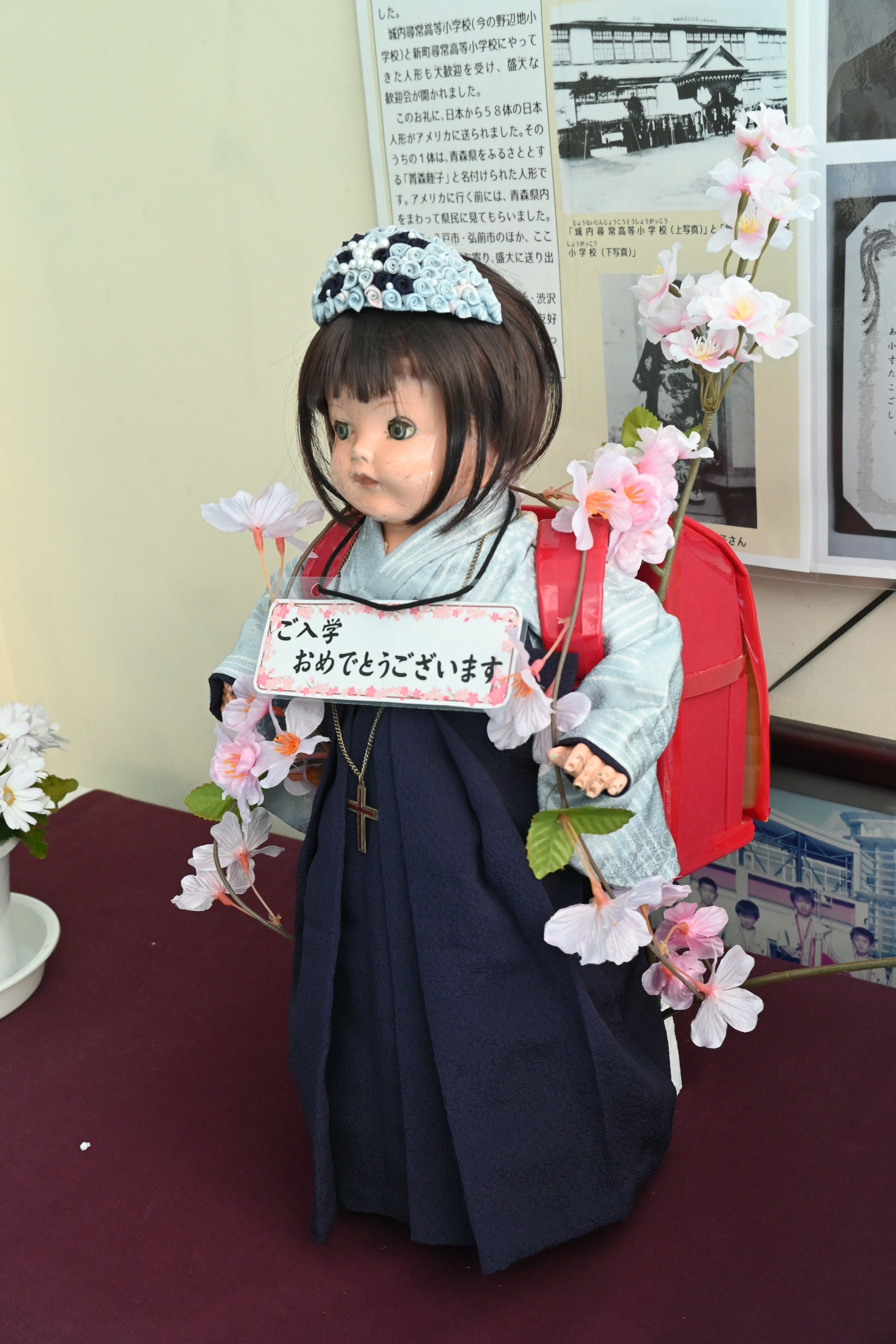 4月上旬、野辺地町の野辺地小学校を訪れると、玄関に「ご入学おめでとうございます」と書かれたプレートを付け、ランドセルを背負い、はかま姿の友情人形「レイワ」がいた。