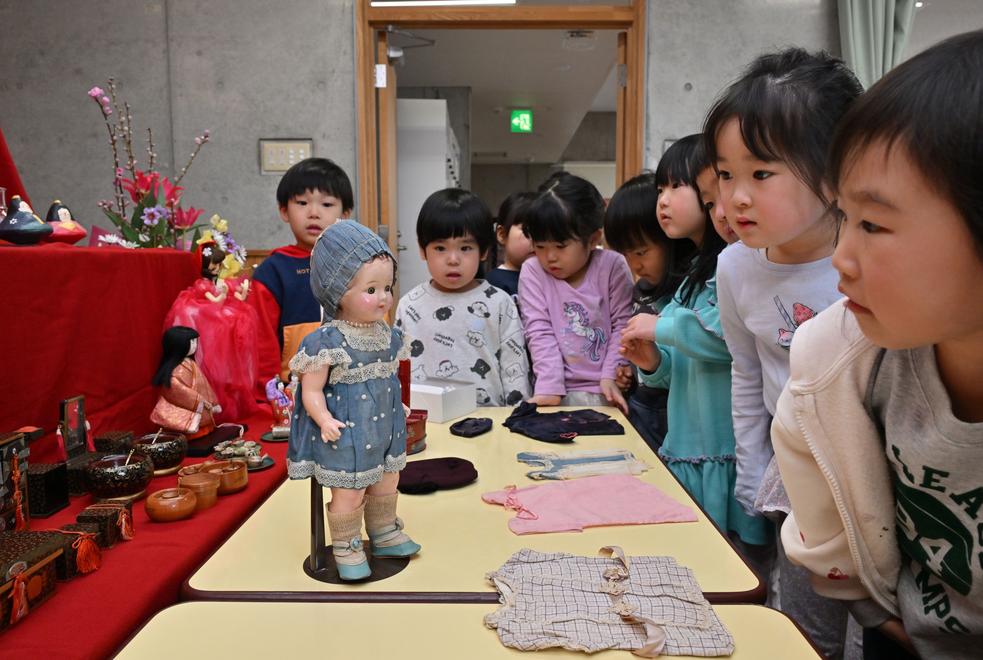 全園児約60人が参加した「桃の節句集会」では、教頭の木村協子(やすこ)さん(42)が人形のこれまでの歩みを話し、園児らが「楽しいひな祭り」などを歌った。竹谷公佑(こうすけ)ちゃん(6)は「土に埋められていたのはかわいそうだったけど、また会えたのはうれしい。戦争がなくなればいいな」、永澤優(ゆう)ちゃん(6)は「服と帽子がかわいかった」と笑顔を見せた。